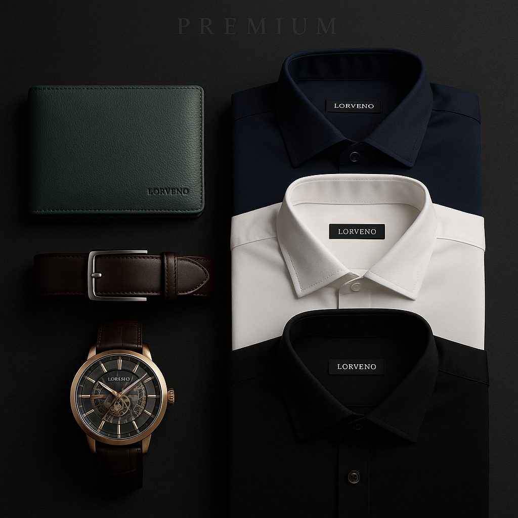 Lorveno products have a luxury international look and feel. The packaging is premium in a black & gold theme – elegant and gift-ready. Every product, from shirts to watches, carries clean and classy Lorveno branding.